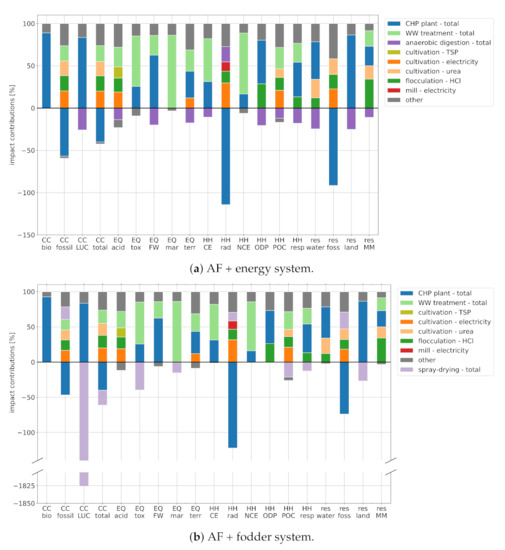 Break-down of environmental impacts: (a) AF + energy. (b) AF + fodder. Note that the bars are normalized by the sum of positive (i.e., damaging) impacts. Abbreviations: CC—climate change; EQ—ecosystem quality; HH—human health; res—resource depletion; bio—biogenic; LUC—land use and land use change; acid—freshwater and terrestrial acidification; tox—freshwater ecotoxicity; FW—freshwater eutrophication; mar—marine eutrophication; terr—terrestrial eutrophication; CE—carcinogenic effects; rad—ionizing radiation; NCE—non-carcinogenic effects; ODP—ozone depletion potential; POC—photochemical ozone creation; resp—respiratory effects; water—water dissipation; foss—fossil; land—land use; MM—minerals and metals.