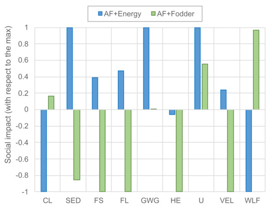 Social life cycle impacts of the AF + energy and AF + fodder systems. Scores are normalized by the highest absolute score in each impact category. Abbreviations: CL—Child Labor; SED—Sector contribution to Economic Development; FS—Fair Salary; FL—frequency of Forced Labor; GWG—Gender Wage Gap; HE—Health Expenditure; U—Unemployment; VEL—Violations of Employment Laws and regulations; WLF—Women in the sectoral Labor Force. Note that SED is the only positive indicator (higher is better), and all other indicators should be interpreted as “lower is better”.