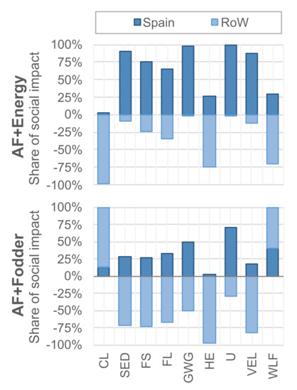 Figure 5 shows a breakdown of risks according to location, distinguishing between Spain and the rest of the world (RoW). For most indicators, both pathways yield social benefits in the rest of the world but create burdens in Spain. The opposite is true for the SED category, which indicates that economic development is fostered domestically, while it is hampered internationally. Furthermore, the AF + fodder pathway augments social risks related to child labor and the share of women in the labor force in the rest of the world. Note that fuel conversion in the Netherlands was found to contribute less than 5% of the medium risk hours in all of the selected social life cycle categories.