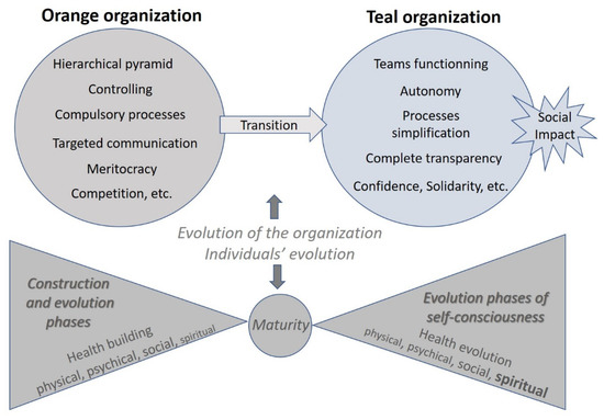 The transition from the Orange to the Teal organization corresponds to the evolution of the organization according to the emerging values in our society and the individuals’ evolution corresponds to the phases of the construction of a human being who has first to build up his identity and his “global health” [37] until his maturity and then to develop his self-esteem and self-actualization (levels of consciousness) according to his values.