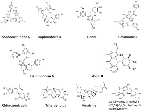 2d structures of the top drug candidates. First five compounds, sophorastilbene A, daphnodorin B, oenin, flavumone A and daphnodorin A, are considered as drug target against DNaA protein, while the remaining compounds, aloin B, chlorogenic acid, triterpenoids, veratrine, and 1,6-dihydroxy-3-methyl-8-[(2S,5S)-3,4,5-trihydroxy-6-(hydroxymethyl)oxan-2-yl]oxyanthracene-9,10-dione, were considered as drug candidates for TCR protein.