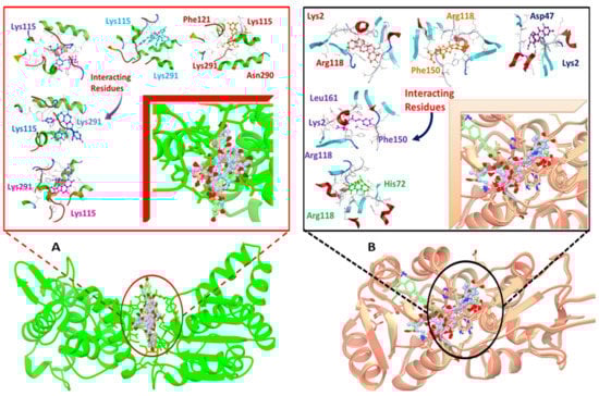 It involved a variety of amino acid residues and interactions for phytochemicals to bind to the active pocket of the target proteins. Lys291, Lys115, Arg118, Lys2, and Phe150 in hydrogen bonding and pi-stacking interactions were the primary residues involved in building the contacts between the top hit ligand conformations and the binding pocket of the target proteins, as shown in Figure 3A,B.