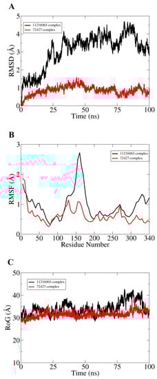 Molecular dynamic simulation for 100 ns was performed to understand dynamics of both targets in the presence of screened hits. Statistical parameters RMSD, RMSF, and RoG were studied for docked complexes to confirm their structural stability. The root mean square deviations (RMSD) were investigated first based on carbon alpha atoms. Deviation in the RMSD plot is an indication of structural variations relative to the initial docked complex inter-molecular conformation [49]. Uniform RMSD plot implies structure equilibrium of the system and more inter-molecular strength as the simulation time proceeds. The DNaA–72427 complex remained stable during the first 50 ns of simulation time; after that, it showed lower RMSD deviation of 0.25 Å and got more stability until the simulation end. The second complex of DNaA (with 11216065) showed stability up to 20 ns; after that, it showed deviations, though minor (of 1 Å), and achieved stability towards the end, as shown in Figure 4A. The TCR–14989 complex showed stability throughout the time frame up to 100 ns, and RMSD reached the maximum of 1 Å. The second complex (with 1794427) showed steady RMSD with deviation at 60 ns, and after that, it showed stability, as indicated in Figure 5A. From the RMSD interpretation, it can be easily concluded that DNaA–72427 is showing more intermolecular stability in term of chemical interactions and conformation thus 72427 can be regarded as high affinity drug molecule for DNaA. On the other side, 14989-TCR complex is more stable in term of binding affinity compared to 1794427-TCR complex. The same trend was noticed for both proteins in remaining simulation analysis.
