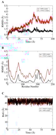 Root mean square fluctuations (RMSF) were calculated next for the simulated complexes. RMSF analysis aids in identifying flexible residues of the targeted proteins and understanding how these fluctuations are affecting complex stability [50]. Graphs of the DNaA target indicate that its complex with 72427 showed minor fluctuations, while its complex with 11216065 showed a deviation of 1.5 Å at one point, as shown in the Figure 4B. The RoG plot trajectories of the DNaA target for the first complex (with 72427) showed a good stability, while the second complex (with 11216065) showed minor deviations indicated in Figure 4C. However, the RMSF plot of the target TCR–14989 complex showed stability at 0.5 Å, while the TCR–1794427 complex showed stability between 1 Å and 1.5 Å, as shown in the Figure 5B. Radius of gyration (RoG) is a parameter reflecting the system’s compactness during simulation time. Lower RoG value refers to a highly compact system and is an indication of system stability. The RoG values for the target TCR showed a good stability for both complexes throughout the time period of 100 ns, as shown in the Figure 5C. All these analyses indicated the targeted proteins were in good dynamics stability in the presence of the virtually screened compounds. The complex intermolecular stability also demonstrated the best fitting between the proteins and the compounds, leading to strong association and, ultimately, stable formation of complexes.