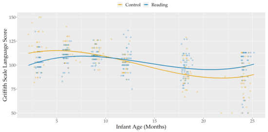 In line with our hypothesis, the decrease in language scores was found to be significantly lower in infants exposed to the book-reading intervention, who showed scores that were more stable and less inclined to decrease over time. This result, consistent with the literature on full term [63,64,65,66,67,68] and on preterm infants [69,70], supports the notion that book-reading interventions could be effective in improving cognitive development and preventing delays in language development in preterm infants.