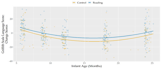 Two-level mixed effects growth curve models were used, using the Hearing and Language Quotient subscale of the GMDS-R as dependent variable, and the main and interactive effects of group (Reading vs. Control) and infant age (in corrected months) as predictors. The main effects of infant gender, birth weight, and gestational age, as well as of maternal education level, were also controlled for in the model, according to previous literature [75,76,82,83,84].