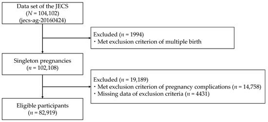 - Kawamoto, T.; Nitta, H.; Murata, K.; Toda, E.; Tsukamoto, N.; Hasegawa, M.; Yamagata, Z.; Kayama, F.; Kishi, R.; Ohya, Y.; et al. Rationale and study design of the Japan environment and children’s study (JECS). BMC Public Health 2014, 14, 25. [Google Scholar] [CrossRef]
