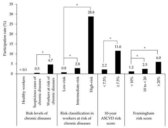 Participation rates for health promotion programs in health risk groups among employees of the semiconductor/liquid crystal display (LCD) company. ASCVD, atherosclerotic cardiovascular disease. * p < 0.001.