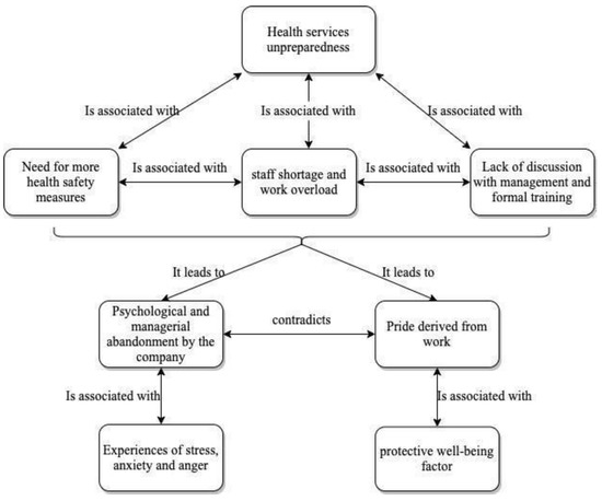 As shown in Figure 1, all the highlighted factors led to perceived psychological and managerial abandonment by the AUP. Like Chiara stated, “The distress I feel during this situation is mostly at the organizational level: where I’m working I don’t feel protected or supported. The organizational system is poor and one feels alone in facing such an emergency” [306:2]. This situation elicits feelings like frustration, anger, stress, and anxiety. For example, Eleonora stated: “I’m disappointed and angry with the system: I feel used, without any recognition” [437:1]. The final evidence that emerged within this theme is the positive consideration with which this questionnaire was received: some participants have underlined their appreciation for this initiative because they felt considered and listened to by the institution, like Rebecca: “Thank you for this opportunity, having the possibility to talk about own experiences is essential” [48:1].