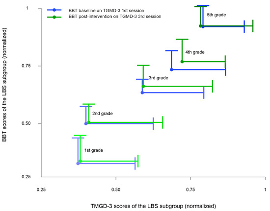 TGMD-3 scores improved with age in all subgroups (LBS, LS, and BS) across all sessions, albeit with some exceptions (Table 9).