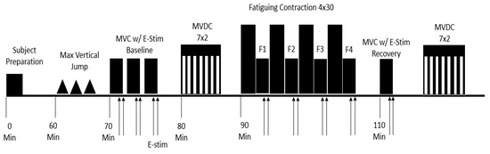 Experimental protocol for both control and supplemental sessions. Upward arrows denote electrical stimulation during maximum voluntary isometric contractions (MVIC) and rest. Hatched bars denote maximal voluntary concentric contractions (30 reps) with a load equivalent to 20% MVIC.