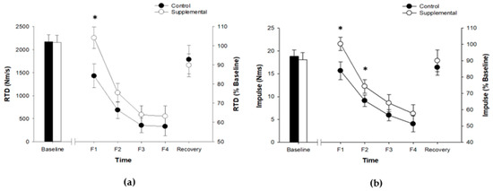 Rate of torque development during first 400 ms of each MVIC (a); Impulse during the first 200 ms of each MVIC (b). F1–F4 denotes ~10 s time duration when MVIC was performed during and after fatiguing tasks. Values are mean ± SE, presented with both absolute (left axis) and relative (right axis) scales. *—Significant difference between two sessions (p < 0.05).