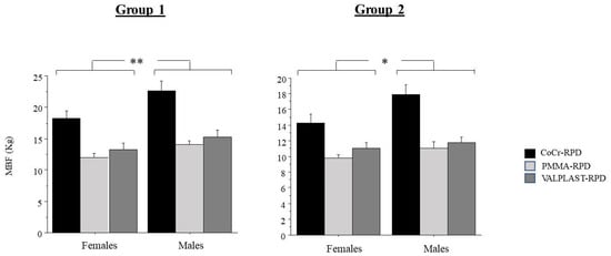 Maximal Bite Force according to gender. MBF = Maximal Bite Force; BMI = Body Mass Index; V-RPD = Valplast Removable Partial Denture; CoCr-RPD = Chrome-Cobalt Removable Partial Denture; PMMA-RPD = Polymethyl Methacrylate Removable Partial Denture. * = p < 0.05; ** = p < 0.01.