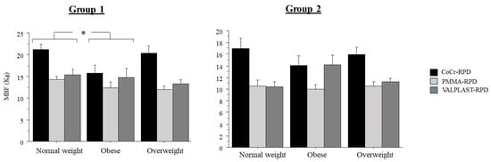 Maximal bite force according to body mass index classification. (MBF = Maximal Bite Force; BMI = Body Mass Index; V-RPD = Valplast Removable Partial Denture; CoCr-RPD = Removable Partial Denture Cobalt-Chromium; PMMA-RPD = Removable Partial Denture in Polymethyl Methacrylate.* = p < 0.05).