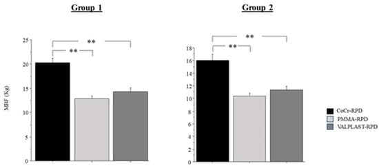 In Group 2, MBF decreases significantly compared to Group 1. These data indicate a worse masticatory situation when both arches are wearing RPDs. In this Group CoCr-RPDs show again the best results.