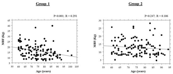 The correlation of bite force with BMI is shown in Figure 5. There was a significant negative correlation between bite force and BMI for Group 1 (p < 0.05; R = 0.208): the bite force decreased in subjects with higher BMI values. There was no correlation between bite force and BMI in Group 2 (p = 0.317; R = 0.092).