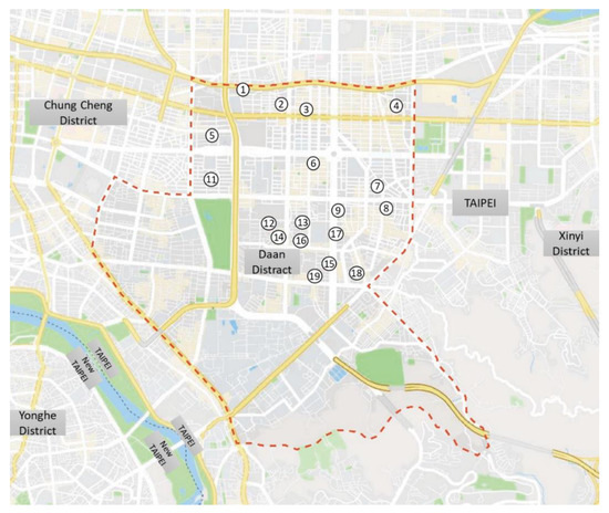 Because of the limited mobility associated with aging, middle-aged and older people tend to engage in outdoor recreational activities in parks near their homes. They also tend to visit parks frequently and at regular intervals to engage in recreational activities [22]. A neighborhood park is a green space with an area of less than one hectare, serves the residents of the neighborhood, and supports activities, such as resting and walking [23]. Therefore, the present study focuses on neighborhood parks as the study sites. Daan District in Taipei City has the highest level of aged individuals, with over 20% of the population aging. The total number of neighborhood parks in Daan District is 53. A three-step process was used to select research sites. First, we checked the demographic data of each ward in Daan District, analyzed the population aging index of each ward, and selected the wards with an aging index of more than 20% from these wards, totaling twenty-one neighborhood parks in this district were included. However, two of these parks were excluded because of construction inside the parks during the data collection. Therefore, the 19 neighborhood parks in Daan District, Taipei City, were used as the survey sites for this study (Table 1, Figure 1).