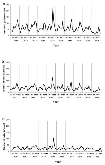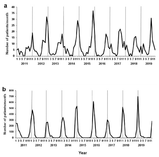 Seasonal changes for viral respiratory tract infections in our emergency department (ED) are shown in Figure 2. The number of patients with RSV and influenza infections showed distinct maxima and minima (Figure 2a,b). Although the peak of RSV infection was observed during winter for 2011–2015, the peak shifted to fall thereafter; this trend was also seen nationwide in Japan (https://www.niid.go.jp/niid/images/iasr/rapid/topics/rsv/150918/rsv1_191215.gif; accessed on 14 August 2020).