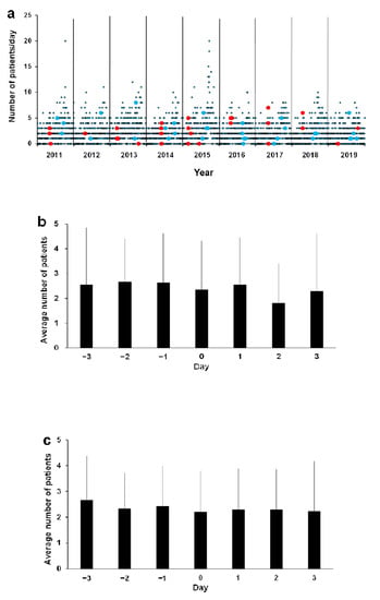 Daily data on air pollutants from 2011 to 2019 in the present study were the same data used in the previous study []. Kobe city publishes daily air pollutant data on its homepage (Hyogo Nanbu Taiki Sokutei Kyoku, http://kobe-taikikanshi.jp/kankyo/; accessed on 14 August 2020), which can be imported into Excel. In this study, the data for 2020 were newly retrieved from the same station, which is one of the main stations in Kobe city (6.05 km from our medical center). The data of SO2, NO, NO2, NOX, OX, CH4, NMHC, THC, SPM (PM ≤ 10 μm), and PM2.5 were obtained. PM2.5 measurements began on July 30, 2012. Therefore, PM2.5 data were included thereafter. The days with Asian dust observed in Kobe city were retrieved from the Kobe city homepage (https://www.city.kobe.lg.jp/a66324/kurashi/recycle/kankyohozen/air/kousa.html; accessed on 14 August 2020).