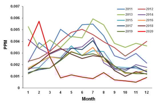 In 2020, the dominant peak of the number of AE patients during spring observed in previous years was not found. To compare the situation between 2020 and previous years, statistically significant environmental factors, temperature and SO2, were compared across years. The average temperature in 2020 was not significantly different compared to that in previous years (average (SD) 17.2 (8.8) °C in 2011–2019 vs. 17.6 (7.7) °C in 2020, p = 0.08, Student’s t-test). However, SO2 in 2020 was significantly lower than the value in the previous year (0.0020 ppm in 2019 vs. 0.0016 ppm in 2020, p = 0.034, Student’s t-test). Notably, although there was a clear year-to-year variation in SO2 from 2011 to 2019 (Figure 4), which was particularly high in May–August (i.e., about twice as high as in winter), SO2 decreased after a nationwide emergency declaration was issued on 9 April 2020. Such air pollution declines during COVID-19 lockdowns have been observed worldwide [,,].