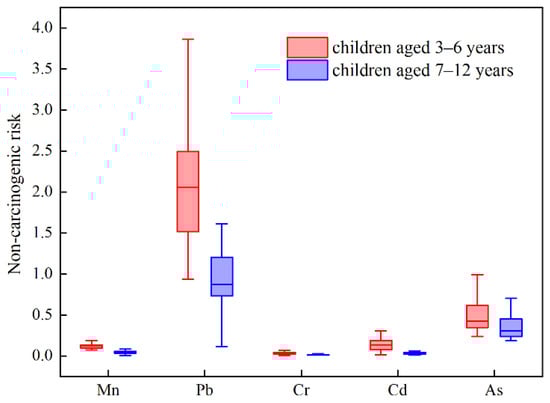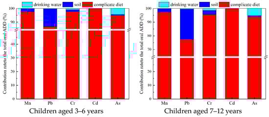 For most metal(loid)s, the exposure contributions resulting from each environmental medium had similar profiles for children in different age groups. However, the contribution of the soil ingestion pathway to Pb intake for children aged 7–12 years was 1.5 times greater than for children aged 3–6 years. Since there was no significant soil metal(loid)s concentration difference between these two age groups, a possible reason for this was that primary school children ingested more soil than 3–6-year-old children [].