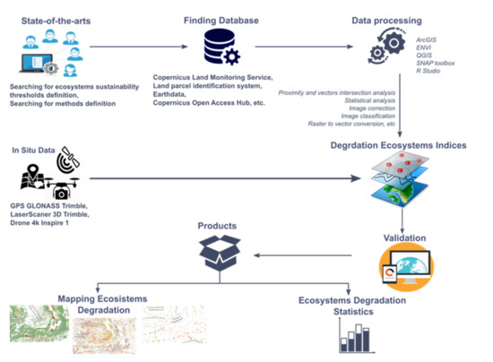 The workflow for the evaluation of the ecosystem’s condition (Figure 2) consisted in three phases. The first phase included state-of-the-art methods for identifying the potential pressures on each ecosystem; searching for ecosystem sustainability threshold definitions; identification of data sets available for the calculation of degradation indicators; data processing and analysis; validation of the applied method. For each ecosystem, a specific assessment methodology was involved. The second phase included correction and adjustment of each indicator used according to the field results; final data processing, field verification and validation. In the final stage, a topological attribute verification was performed.
