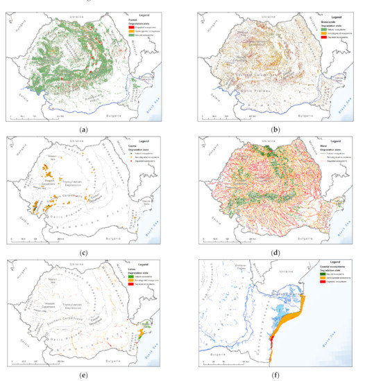 The integration of each Romanian ecosystem type assessment indicated that the coastal ecosystem is the most degraded ecosystem, with 86.55% degraded area (1362.32 km2). The grassland ecosystem’s evaluation resulted in classification of 38.59% area of grassland as being degraded (12,486.37 km2), while 27.64% of river ecosystems were degraded (23,800.22 km length),