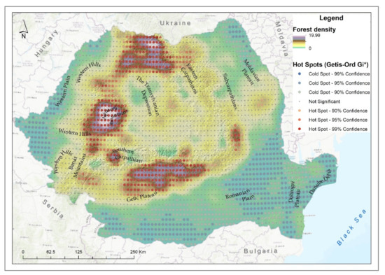 The highest density of degraded forest ecosystems was identified in the Northeastern Carpathians, the northern group of the Western Carpathians and in the Southern Carpathians and also in the Sub-Carpathians (Figure 4). Moreover, in these areas, the confidence level of the hotspot was over 99%. The extensive forest areas that were deforested in northern Romania, in the Maramureș Mountain area led to landscape degradation and decreased air quality and contributed to the aggravation of the negative effects of torrential floods due to the limited capacity to retain water in the canopy.
