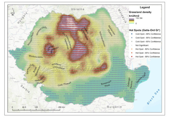 The highest density of degraded grassland ecosystems was identified in the Northeastern Carpathians, in the Transylvanian Depression, the north, central-eastern and southern parts, and the confidence level of the hotspot was over 99% (Figure 5). A high density was also observed in the Nordic group of the Western Carpathians.