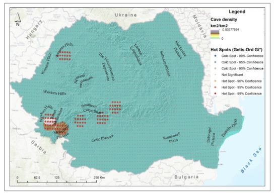 The density of degraded cave ecosystems in Romania is very low; however, some hotspots can be observed in the south of the Western Carpathians and in the Southern Carpathians (Figure 6). Cold spots identified for mountain areas with a high density of caves in the case of the Apuseni Mountains were due to their low degradation, many of them presenting species from the Red List of Romanian cave fauna [70]. The hotspots identified for the degraded caves were concentrated in the northern Apuseni Mountains, the Banat Mountains, the southern Retezat and Parâng mountains, as well as in Fagaraș (Figure 6). In these areas, there are numerous caves with a high number of tourists, which increases in temperature by up to 2 degrees and increases the pathogenic microorganisms, as determined locally and in studies conducted for Muierilor Cave and Polovragi Cave (from Parâng Mountains) and Urșilor Cave and Meziad Cave (from Apuseni Mountain) [71].