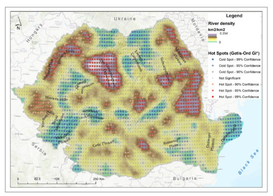 The density of degraded river ecosystems was very high in the northern and central part of the Transylvanian Depression, in the northern half of the Western Plain but also in the south of the Moldavian Plateau (Figure 7). Statistically significant hotspots were also registered in the central northern part of the Romanian Plain, in the northeast of the Moldavian Plateau and in the south of the Eastern Carpathians.