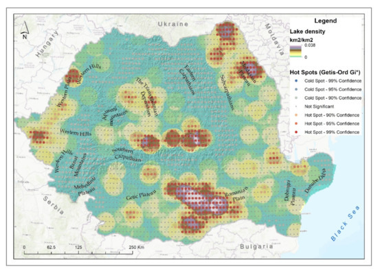 The highest density of lake ecosystems was identified in the central part of the Romanian Plain, in the south of the Transylvanian Depression and in the north of the Moldavian Plateau (Figure 8). Statistically significant hotspots could also be observed in the Western Plain.