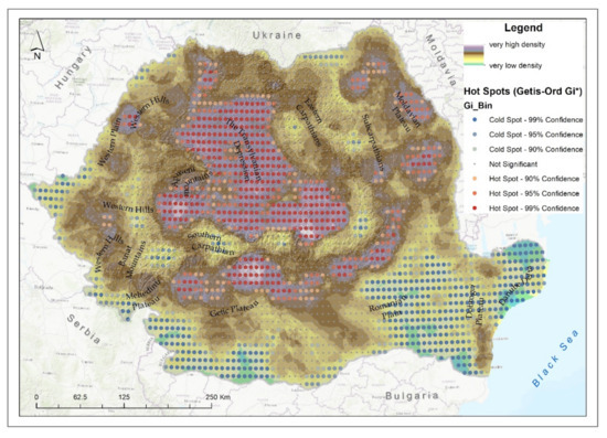 This highlights a statistically significant high density in the central part of the country due to the numerous natural meadows that are in a medium and high degradation stage due to the anthropogenic pressure on them, the high number of river segments that are in an advanced stage of degradation due to numerous sources of pollution mainly caused by the lack of septic tanks and the inefficient use of chemical fertilizers in agriculture and the south of the Carpathian Mountains, where, along with the declining forest, there are a high number of degraded meadows but also degraded river segments.