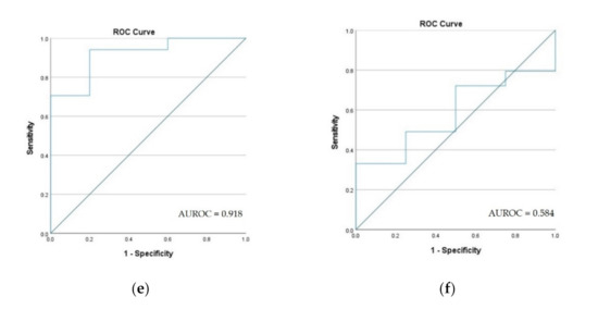 Relative operating characteristics (ROC) curve and AUROC value for degraded ecosystems. (a) Forest ecosystems; (b) grassland ecosystems; (c) cave ecosystems; (d) river ecosystems; (e) lake ecosystems; (f) coastal ecosystems.