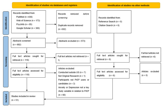 Two of the authors (SM and SH) collaboratively developed the search strategy and inclusion criteria. Key terms related to PrEP, anxiety, depression, and mental health were used to search PubMed, PsycInfo, Web of Science, and Google Scholar. Detailed search criteria are shown in Table 1. The final search was conducted on 27 August 2021. All results from PubMed, PsycInfo, and Web of Science were screened, and the first 300 results from Google Scholar were screened, as recommended for searches aimed at academic literature [31]. The following inclusion criteria were used: (1) full text article written in English, (2) conducted in US, (3) published in a peer-reviewed journal, (4) published between January 2012 and July 2021, (5) described original qualitative or quantitative research, (6) included participants on PrEP or PrEP candidates (i.e., individuals from groups at high risk for HIV including MSM, transgender individuals, and PWID), and (7) included measures of depression and/or anxiety (i.e., symptoms or clinical diagnoses) as key study variables (e.g., independent variable, dependent variable, mediator, moderator, inclusion criteria, or qualitative focus) in relation to the PrEP care continuum step(s). The review was limited to articles written in English due to study team constraints. It was limited to studies conducted in the United States because of the varying nature of HIV epidemics and presentation of mental health disorders across geographic and cultural settings. Finally, 2012 was selected as the beginning year for inclusion as that was the year of PrEP’s initial approval in the US [6].