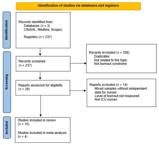 A systematic review with meta-analysis was performed following the PRISMA recommendations (Preferred Reporting Items for Systematic Reviews and Meta-analyses) [14]. The search was carried out through the databases Medline (PubMed), Scopus (Elsevier), and CINAHL (EBSCO). Using the MeSH terms the search strategy was “burnout AND nurses AND intensive care units”. The search was conducted in December 2020.