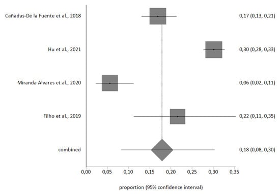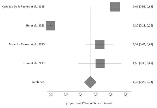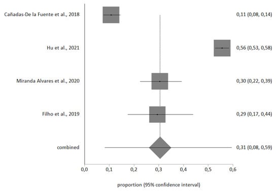 The meta-analytic estimate prevalence for high EE was 31% (95% CI, 8–59%), for high D was 18% (95% CI, 8–30%), and finally for low PA was 46% (95% CI, 20–74%). The forest plots are shown in Figure 2, Figure 3 and Figure 4.