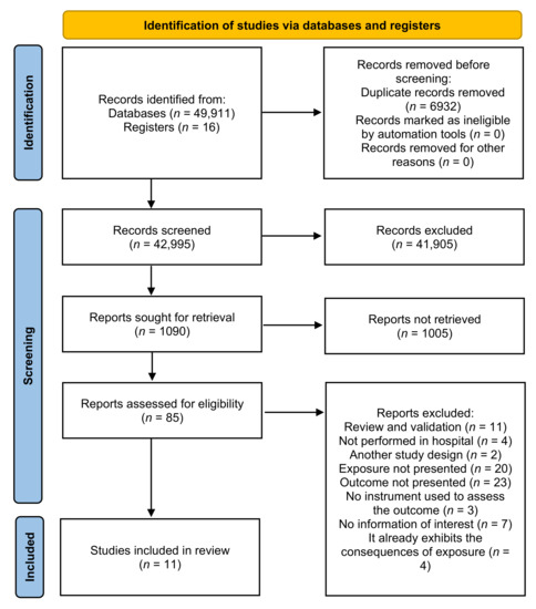 The selected studies were read in full to identify those eligible for the investigation. Disagreements between reviewers were discussed and solved by consensus, and when necessary, a third reviewer’s advice was sought. The information of the included studies was recorded in a spreadsheet prepared in Microsoft Excel, version 2010, with the following data: title, author, year of publication, country, study’s objective, type of study, sample, study duration, type of hospital, main sample characteristics, evaluated exposure variables, instruments used to assess exposure and outcome, primary results, and the main conclusions and limitations of the study.