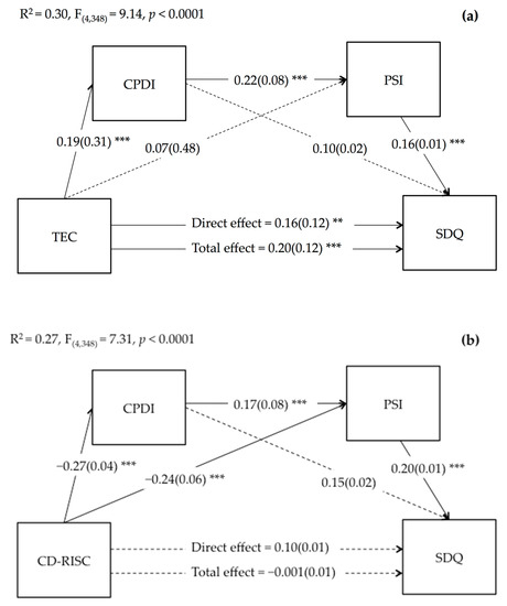 Serial mediation of parent’s COVID-19 peritraumatic distress (CPDI) and parenting stress (PSI) on the relationship between parent’s traumatic experiences (TEC) (a) and parent’s resilience (CD-RISC) (b) with children’s difficulties (SDQ). Coefficients shown are standardized path coefficients. Dotted lines represent non-significant parameters. ** p < 0.01, *** p < 0.001.