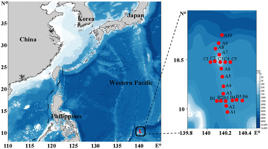 The survey was carried out in the seamount area of the Western Pacific Ocean (9°58′–10°45′ N, 140°2′–140°21′ E) from May to June, 2019. Altogether, 80 water samples were collected at 21 sampling sites that belonged to three sampling sections (Figure 1). Of those sampling sites, sampling sites in section A, section B, and section C were in the vicinity of seamounts on the Caroline Ridge. At each sampling site, water samples were collected at 1–7 different depths, with the sampling depths ranging from 0 m (i.e., surface) to 2300 m. Each sample was filtered using 200 μm mesh (Hebei Anping Wire Mesh Co., Ltd., Hengshui, China) to remove large suspended solids, larger zooplankton, and phytoplankton, followed by a second filtration through a 0.2 μm polycarbonate membrane (Millipore, Burlington, MA, USA) using a vacuum filtration pump with negative pressure below 50 kPa. The filter membranes were transferred in tubes and were then snap-frozen in liquid nitrogen and stored at −80 °C until processed for DNA samples.