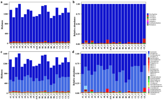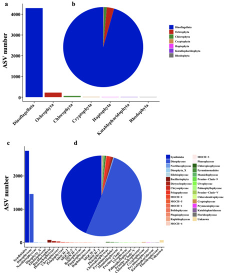 Among these 7460 ASVs, 4601 ASVs were further classified into seven phyla/divisions including Dinoflagellata (4298 ASVs), Ochrophyta (220 ASVs), Chlorophyta (60 ASVs), Cryptophyta (15 ASVs), Katablepharidophyta (5 ASVs), Haptophyta (2 ASVs), and Rhodophyta (1 ASV) (Figure 3a). Thus, the richness of Dinoflagellata was by far the most dominant among all phyla/divisions. The relative abundance of Dinoflagellata ASVs was also by far the highest (95.61%), followed by Ochrophyta (2.94%) and Chlorophyta (1.17%) (Figure 3b). Of all classes of these seven phytoplankton phyla/divisions, the richness of Syndiniales (2754 ASVs) was the highest (Figure 3c), and the relative abundance of Dinophyceae was the highest (51.22%) (Figure 3d); both classes belong to Dinoflagellata.
