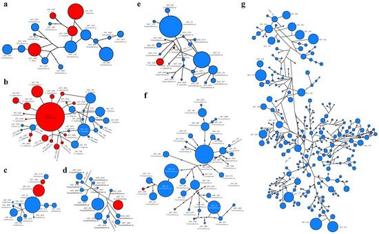 Phylogenetic network analysis of representative genera identified in the Western Pacific seamount regions. (a) Alexandrium; (b) Karenia; (c) Azadinium; (d) Margalefidinium; (e) Gymnodinium; (f) Prorocentrum; (g) Dino−Group−I−Clade−5_X. The size of the circles represents relative abundance of each ASV, while red color represents HAB species.