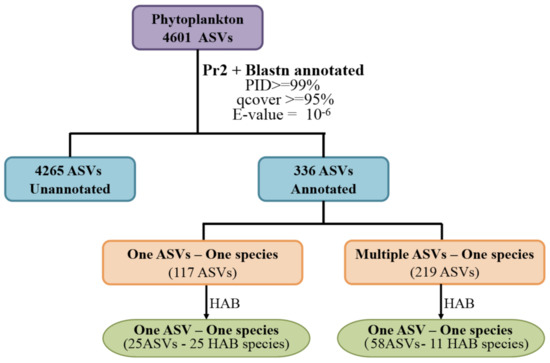 The sequencing results were analyzed using the R package DADA2 [17,18]. We set the parameters as follows: maxEE = c (2,2); minLen = 200; truncLen = c (220,220); Min overlap = 12; basesminBoot = 80. In this study, ASVs supported by two or more reads were selected for further analysis. Then, we removed low-abundance ASVs. Only ASVs that were supported by 0.01% of reads in at least one sample were included in further detailed analysis (Figure 2). The ASVs were annotated as part of the DADA2 analysis pipeline to the species according to Protist Ribosomal Reference database [21] (https://github.com/pr2database/pr2database, PR2, accessed on March 2021). For the ASVs that were not annotated in this step, we searched the NCBI NT database using blastn (E-value = 10−6, qcovs > 95) with a PID threshold of 99.00%. Based on the relationship between ASVs and species, ASVs were divided into two groups. The first group contained ASVs that had clear one ASV–one species relationship, while the second group contained ASVs in which multiple ASVs corresponded to one species (in this group, we chose the five ASVs with the highest abundance). An ASV was annotated as an HAB species if it had been reported as an HAB species in previous studies.