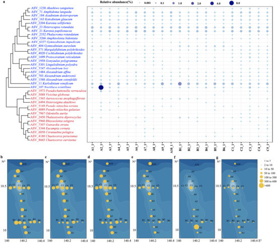Distribution of HAB species in the Western Pacific seamount regions. (a) The distribution and relative abundance of 36 HAB species identified in the surface seawaters of the Western Pacific seamount regions. Cladogram was constructed using the 18S rDNA V4 region sequences of 36 HAB species. The sizes of the blue circles represent the species’ relative abundances; (b) Karlodinium veneficum (ASV_11), (c) Karenia papilionacea (ASV_21), (d) Heterocapsa rotundata (ASV_23), (e) Amphidoma languida (ASV_71), (f) Noctiluca scintillans (ASV_107), and (g) Katodinium glaucum (ASV_163).