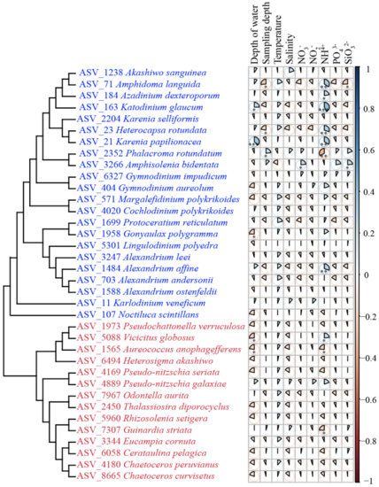 ASVs richness and relative abundance at the phylum and class levels were counted using Python scripts. The histogram figures, pie charts, and bubble chart were drawn with the R package ggplot2 [29]. Correlations of the environmental factors with HAB species were carried out by R package psych [30], and the figures were drawn by R package corrplot [31].