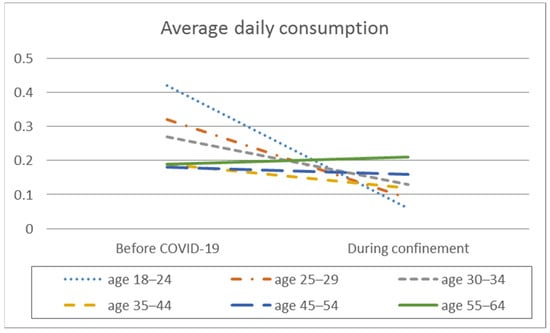 Average frequency of consumption by age before the pandemic and during COVID-19 confinement.
