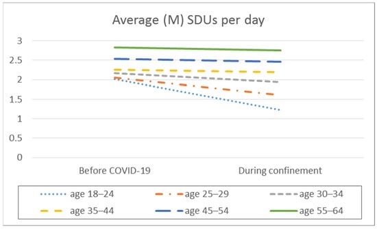 In terms of the average number of SDUs consumed per day, significant differences were found between the different age groups before confinement (F(5.2338) = 7.551; p < 0.001; E2 = 0.016) and during confinement (F(5.2338) = 3.925; p < 0.01; E2 = 0.008), with small effect sizes. Post hoc analyses show that, before the pandemic, the 18 to 24 age group had higher average daily consumption of SDUs than the other groups (p < 0.001). However, during confinement, the 18 to 24 and 25 to 29 age groups showed a lower average daily consumption of SDUs compared to the 55- to 64-year-olds (p < 0.001).