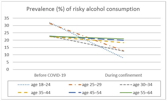 Prevalence (%) of risky alcohol consumption by age before the pandemic and during COVID-19 confinement.