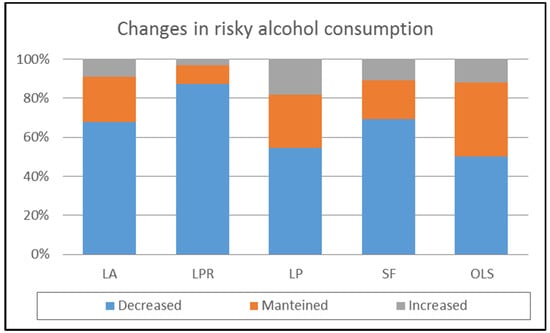 Changes in risky alcohol consumption during COVID-19 confinement considering the living situation. Note: LA = Lived alone; LPR = Lived with parents or other relatives; LP = Lived with partner; SF = Shared a flat with other people who were not the partner or family; OLS = Other living situations.