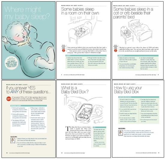- Russell, C.; Whitmore, M.; Burrows, D.; Ball, H.L. Where might my baby sleep? Design and evaluation of a novel discussion tool for parent education. Int. J. Birth Parent. Educ. 2015, 2, 12–16. [Google Scholar]